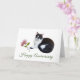 Um gato preto e branco segura uma rosa rosa neste doce cartão de aniversário.