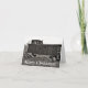 Cartão de Natal com fotografia a preto e branco de um gato siamês ao lado de um trem nas montanhas, com um dentro clássico de cartões de natal.