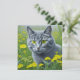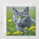 Gato cinza de ai bonito com olhos amarelos cercado por uma ilustração no estilo de um livro de flores.