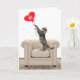 Gato de mesa parado em uma cadeira de couro brincando com um balão de coração vermelho para o aniversário de 81ruas.