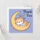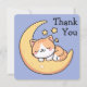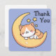 Design de cartões de agradecimentos bonitinho e caprichoso com um desenho animado, laranja e gatinho branco dormindo pacificamente numa lua amarela brilhante. O fundo é um céu azul calmante, adornado com três estrelas amarelas brilhantes. Perfeito para amantes de gatos, esta design adorável captura uma vibração sonhadora e acolhedora.