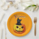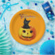 Conjunto de placas de papel, cada uma com uma imagem vintage do Dia das Bruxas mostrando um gato muito bonito sentado numa abóbora de um design Ellen Clapsaddle.