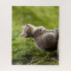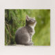 Quebra-cabeça com a imagem de um gato sentado por uma árvore com árvores verdes desfocadas no fundo.