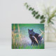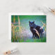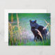 Um gato preto com olhos muito intensos olhando intensamente para dentro de uma armação, cercado de cores surreais entre grama e ervas daninhas.
