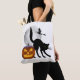 Saco para adolescentes ou adultos durante a época das bruxas. Saco branco com gato preto, Jack o'lanterna, bruxa voadora e design de lua de cheio na frente. Uma redação grande de "truque ou tratamento" no verso em laranja pode ser removida ou alterada. Os caracteres especiais do texto serão suprimidos. A design é perfeita para qualquer criança ou adolescente que goste de picar ou tratar. O branco aparece melhor à noite também. Ou usá-la para comprar durante o feriado.