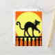 A imagem é de meu desenho original. Este gato preto assustador com olhos verdes está andando através da parte superior de uma cerca preta. Há uma lua amarela enorme contra um céu alaranjado no fundo. Veja minha arte da loja daqui até março para produtos de harmonização com este design.