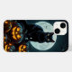 Gato preto assustador com olhos brilhantes amontoados em abóboras, perfeito para camisas de Halloween e adesivos.