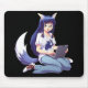 Um foxgirl azul-de cabelo do anime trabalha em um computador portátil.