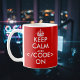 Geeky mantenha a calma e o código na caneca para programadores. Criar seu próprio engraçado mantêm a calma e continuam a paródia. Por exemplo com o Perl ou o sql do Javascript do PHP java do HTML. Personalize cores e texto do fundo a maneira que você a quer.