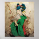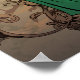 Geisha 芸 poster de impressão japonês 者com uma Geisha vestida de verde com seu fã de mão, flores na cabeça e folhas de rolagem marrom em fundo verde.