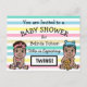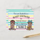 Aqui estão os bonitinhos feitos com a mão, os convites para bebês e gêmeos e meninas Baby Shower. Personalize-os adicionando as informações do seu partido na área de personalização. Listras cor-de-rosa, azuis, verdes, roxas e bronzeadas no fundo com um menino e uma menina gêmea em cada esquina. Estes convites postais são uma forma muito barato de receber convites personalizados pré-feitos para duches de bebês. Esses bebês representam bebês afro-americanos.