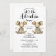 Que a aventura comece o convite de chá de fraldas de gêmeos brancos, com ilustração de elefantes para bebês neutros em termos de gênero. Tipografia de script de caligrafia.