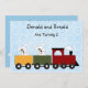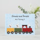 Cute Puppies com um círculo à volta de um olho. Os cachorros gêmeos estão andando em um trem vermelho. Perfeito para os convites de gêmeos. Adequado para meninos, personalize com os detalhes da sua festa.