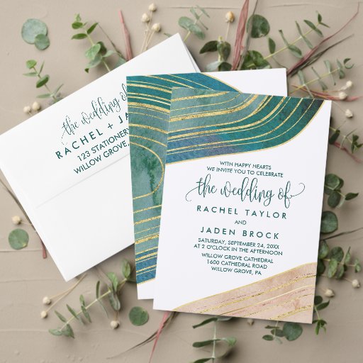Este cartão de janto de gemstone é perfeito para um casamento moderno. A elegante design de praia apresenta duas incríveis pedras de gema agata em verde esmeralda e borrão com bobina de ouro falsa. A proteção apresenta uma fatia de agate de coordenação. Este menu pode ser usado para recepção de casamento, janto de ensaio ou qualquer evento. Nota: Este design não apresenta folha de ouro real. É um gráfico de alta qualidade feito para se parecer com folhas de ouro.