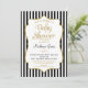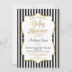Um convite elegante de chá de fraldas preto e dourado, com falso quadro de sotaque dourado e listras pretas e brancas com texto preto e dourado. Este convite para chás de fraldas moderno é super na moda. Sexo neutro, é apropriado tanto para um convite de chá de fraldas de menino quanto para um convite de chá de fraldas de menina.