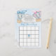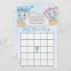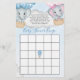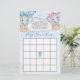 Este gênero branco revela um bingo chá de fraldas que apresenta um adorável bebê e elefantes-menina voando entre as nuvens em balões de ar quente azul e rosa sobre um fundo azul de aquarela. Fácil de personalizar com opções personalizadas clicando no botão "Personalizar".