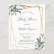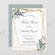 Um fundo branco na moda na frente. Decorado com eucalipto e lavandas florais. Um quadro geométrico dourado. Personalize e adicione um nome e detalhes. Fundo: fundo colorido de cinza verde.