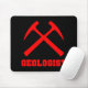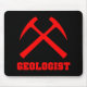 Geólogo - letras colegiadas vermelhas e martelos de rock cruzado, gráficos com fundo preto.