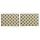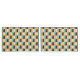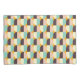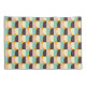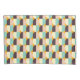 Geometric pattern with overlapping half-circles in teal, cream, brown, and peach on an orange background, creating a vibrant and retro feel.