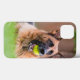 German shepherd fêmea de cachorro com uma bola de tenis na boca sentada sobre grama.
