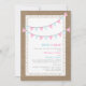 Um convite de festas de gênero revela uma ilustração de um revestimento de gingham rosa e azul no topo. O fundo é uma rajada inspirada em design inspiração de renda.