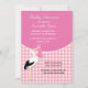 Convite para chá de bebê na moda, feito em um padrão de verificação de gingham rosa e branco e gráficos bonitos de uma cegonha segurando um feixe de bebês rosa. Personalize o texto branco e preto para o evento do seu chá de fraldas. Adorável convite para a futura mãe.