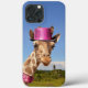 Para um pouco de diversão, aqui está uma girafa num chapéu cor-de-rosa cintilante e colar de rico. Há espaço para você adicionar seu próprio texto personalizado, se quiser. Vá em frente e divirta-se com isso. Esta imagem foi criada manualmente e não é gerada por IA.