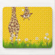 Uma girafa bonita a espreitar com margarida na boca, com grama verde sobre bolinhas branca e fundo colchado amarelo. A costura do topo é feita digitalmente.