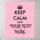 Faça suas posters tranquilas com este modelo personalizável. Tem o logotipo calmo da coroa em preto e palavras em letras negras. Adicione seu próprio texto na modelo para personalizar. Você terá um poster personalizado por sua conta. O KEEP CALM está na fonte padrão, mas seu texto está em uma fonte cinza e cinza. Você pode alterar os estilos de fonte ou as cores para personalizar. Ou alterar o tamanho do poster. Você também pode alterar a cor do plano de fundo se quiser. Neste momento está numa ou numa rosa claro pálida. Fique mais calma, posters, camisas e itens personalizáveis em Mantenha Calma e Seu.