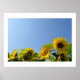 Os girassóis amarelos bebem no sol de agosto. Foto colorida cercada por uma borda branca para fácil enquadramento ou enforcamento.