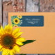 Design apresenta um buquê de girassóis amarelados de cor d'água, eucalipto e outras folhas e galhos sobre fundo azul marinho.