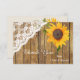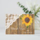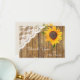 Este cartão de agradecimento plano apresenta uma imagem deslumbrante de um girassol dourado brilhante espiando do lado direito de um fundo de painel de madeira radiante. O girassol toca uma adorável borda de canto de renda branca à esquerda. Seu texto personalizado está em branco na parte inferior. A parte de trás do cartão é suave bege claro, com uma imagem menor do girassol e uma área em branco para sua própria mensagem. *Este design usa arte floral da LeCoqDesigns.