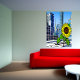 Girassol no telhado com uma cidade grande ao fundo com céu azul e nuvem branca. Esta é uma arte gerada por IA.