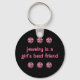 Chaveiros cor-de-rosa dizendo "joias é o melhor amigo de uma menina" com bonito diamantes rosas impressos em um fundo preto. Projetado para mulheres ou meninas que amam a cor rosa ou colecionam coisas cor-de-rosa, e adoram joias. Coisa rosa perfeita para garotas adolescentes, favoritos para festas, ou apenas uma maneira divertida de carregar suas chaves ou chaves de carro.
