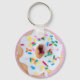 Uma rosquinha de bolo com glacé de baunilha e borrifos coloridos em uma placa rosa. Bonita e elegante.