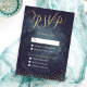 Caligrafia com letras douradas em glamor caligrafia RSVP design e pontos dourados confetti sobre fundo de cor d'água do céu escuro, efeito brilhante metálico de brilho dourado, moderno, chico, elegante e elegante, perfeito para casamento vintage ou casamento no inverno à noite. Personalize o seu próprio cartão RSVP para o seu conjunto de convites para o casamento. Veja todas as peças correspondentes nesta coleção de caligrafia de glitter de ouro da noite de Glam abaixo.
