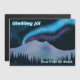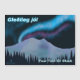 Luzes de norte roxas e azuis brilham sobre montanhas cobertas de neve em uma noite fria no Alasca. O texto islandês que lê "Gleðileg jól" (Feliz Natal) aparece em azul e branco brilhantes. Adicione seu próprio texto adicional.