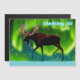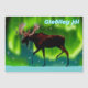 Uma imagem de um alce silenciada contra as luzes do Norte, um pouco estilizada. O texto islandês que lê "Gleðileg jól" (Feliz Natal) aparece em azul e branco brilhantes.