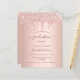 Um convite feminino e glamouroso para uma festa de formatura. Glamoroso com elegante e moderno fundo metálico falso de ouro rosa e decorado com gotas de brilho falso de rosa dourado, aparência de pingar. Modelo para detalhes de nome e festa. O texto Graduação e o nome são escritos com um script de estilo manuscrito moderno. Texto rosa dourado escuro. Traseira: fundo rosa dourado e gotas de brilho.