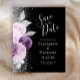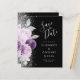 A borda esquerda deste elegante casamento moderno, exceto o cartão de data, apresenta um buquê floral em tons de roxo e lavanda, cortado com folha de cor prateada e folhagem falsa e borrifada com cintilação falsa e salpicada com cintilação falsa prateada. O texto personalizável combina o script de escrita manual de cinzas prateadas pálidas, fontes em copperplate e itálico em um fundo preto. O verso apresenta um design floral correspondente.