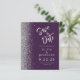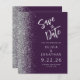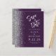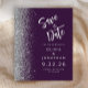 A borda esquerda deste elegante casamento moderno salve o cartão de data apresenta uma borda cintilante. O texto personalizável combina o script de escrita manual de cinzas prateadas e o tipo de letra sans serif num fundo roxo escuro. O verso apresenta um design púrpura e prateado.