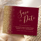 Este elegante orçamento salva a placa de data apresenta uma borda de falso brilho dourado ao longo da borda esquerda. O texto personalizável combina um guião branco dourado, um guião manuscrito branco, fontes em copperplate e itálico em um fundo vermelho arrojado. O verso apresenta um design de burgundy e dourado.