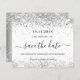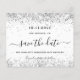 Uma elegante Salve a placa Data para uma festa de aniversário 40th (ou qualquer idade). Na frente: Um fundo branco na moda decorado com faíscas de brilho. Personalize e adicione uma data e nome/idade 40. O texto: Salvar a Data é gravado com um script de estilo com letra de tendência grande. Volta: fundo com aspecto sujo de prata e faxes de prata.