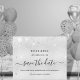 Uma cinta e moda Salve a placa Date para uma festa de aniversário 40th (ou qualquer idade). Um fundo metálico moderno, falso e prateado, decorado com poeira falsa. Personalize e adicione uma data e nome/idade 40. Letras pretas coloridas. O texto: Salvar a Data é gravado com um script de estilo com letra de tendência grande.