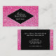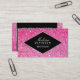 Uma brilhante imagem de fundo rosa brilhante fornece um cenário giro e divertido para este modelo de cartão de negócios de beleza. Seu nome ou nome comercial é elegantemente estirado em uma placa de nome cortada em prata para um logotipo clássico. Motif na moda design para salões de beleza, designers de unhas, maquiadores, cosmetólogos, estilistas de moda, boutiques e muito mais. © 1201AM CREATIVE