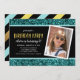 O Convite de aniversário Teal Glitter Photo apresenta as palavras "Festa de aniversário" em uma fonte sans serif divertida em uma folha de ouro falso, com um fundo brilhante superior e inferior e um fundo preto no centro. O convite tem um padrão de tiras de folhas de ouro preto e preto e esfarelado atrás. Personalize-o substituindo o texto do marcador de posição e substitua a foto do marcador de amostra/marcador de posição por sua própria foto. Para obter mais opções, como alterar a fonte e seu tamanho/cor ou o espaçamento entre letras, clique no botão "Personalizar". *Observe que a Marca d'água do Zazzle que aparece na visualização de zoom NÃO aparecerá no produto impresso final. Espaço reservado Fotografia © Storytree Studios, Stanford, CA Invitation © Rosewood and Citrus