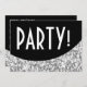 Convite com um design moderno com estrelas espalhadas sobre uma forma estilizada de "aparência sequencial" curvada em tons de cinza prateada contra um fundo preto com 'Partido!' escrito em branco. Pode ser usado como um fundo para o seu próprio texto, imagens e ideias. O texto pode ser facilmente alterado usando o modelo fornecido ou clique no botão 'Personalizar o texto' para fazer outras alterações. Observe que esta é uma imagem de arte digital impressa, ela não brilha ou contém cinzas ou sequências reais.