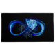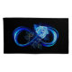Luminous infinity symbol with glowing, beautiful, lushly blooming rose made of blue flames on black background.