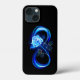 Luminous infinity symbol with glowing, beautiful, lushly blooming rose made of blue flames on black background.