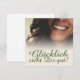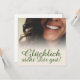 Glücklich, Dir, instinto! Kompliment Karte mit lachendem Frauengesicht und handschriftlichen Grüßen auf der Vorderseite der Karte. Restliche Flächen stehen zur freien Verfügung.